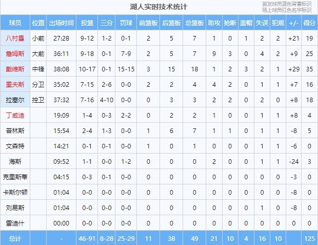本场比赛,湖人板凳席依然没有提供足够的火力支援,替补合计拿到12分,普林斯4中2拿5分替补最高,丁威迪4中1得4分,海斯1中1有3分。