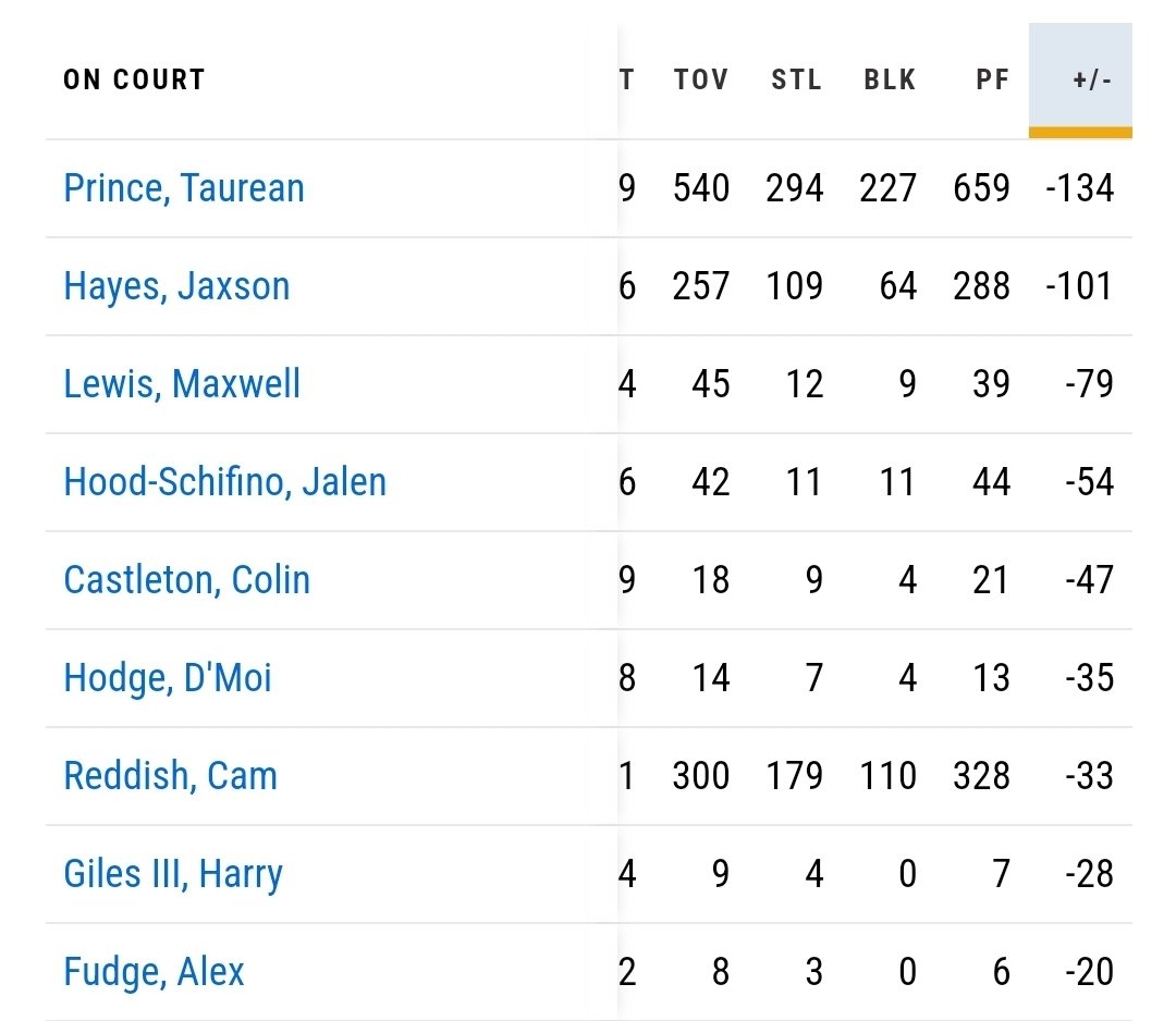 他晒出湖人替补球员的总正负值,均为负数,其中普林斯总正负值-134排名队内倒数第一。