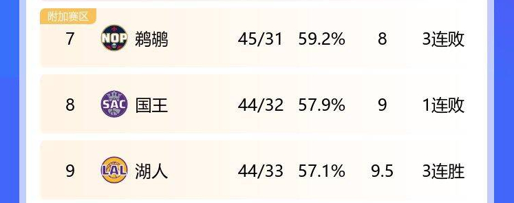 国王输球之后战绩变成44胜32负,继续排在西部第八,和第九的湖人胜场差被缩小到0.5个。