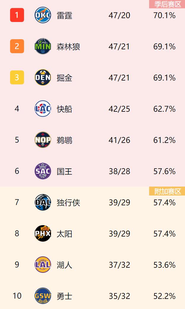 勇士输球时,战绩来到35胜32负,排名跌至西部第10,湖人36胜32负直接升上第9!