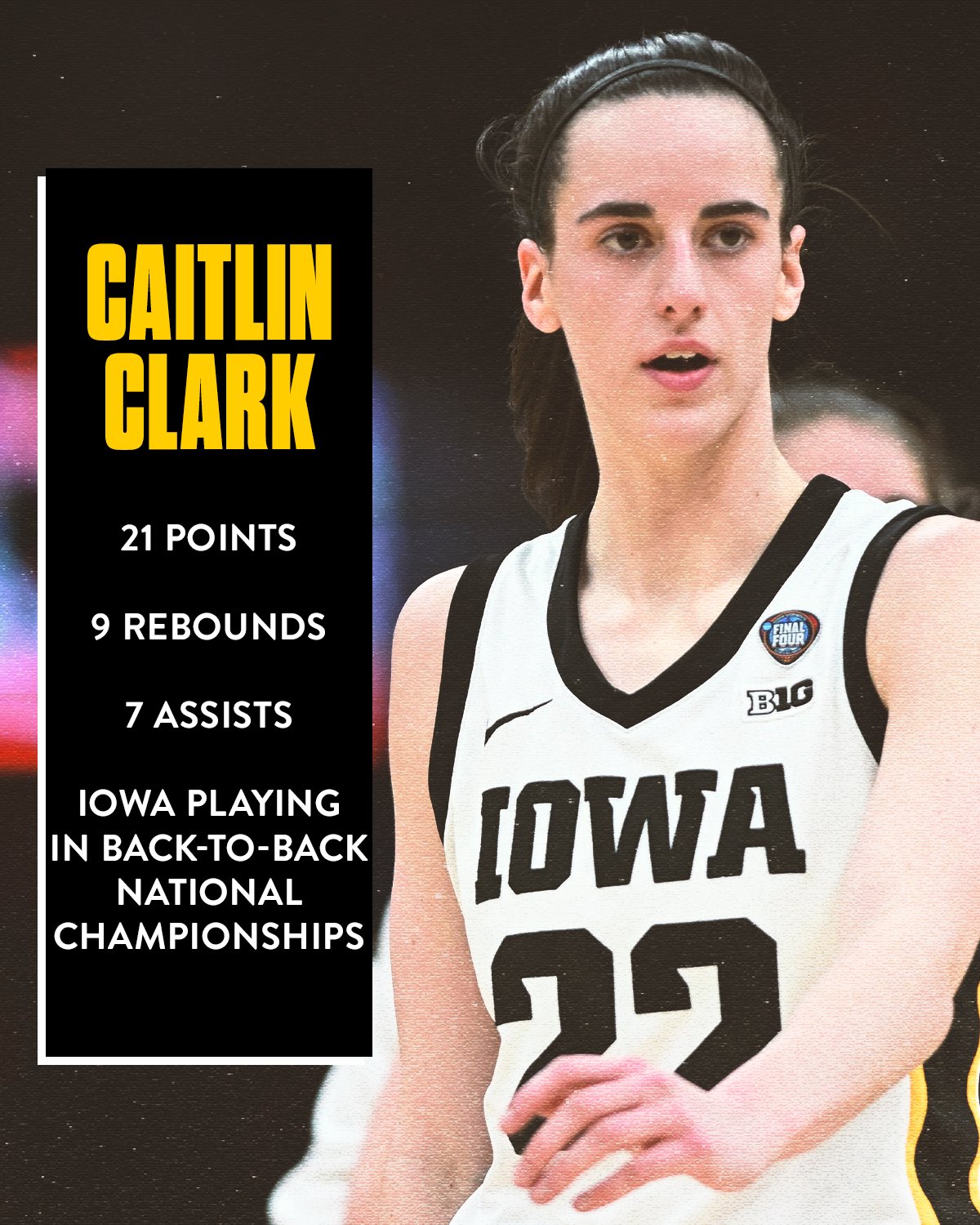 “女库里”凯特琳-克拉克18中7,三分11中3,拿到21分9篮板7助攻2抢断。