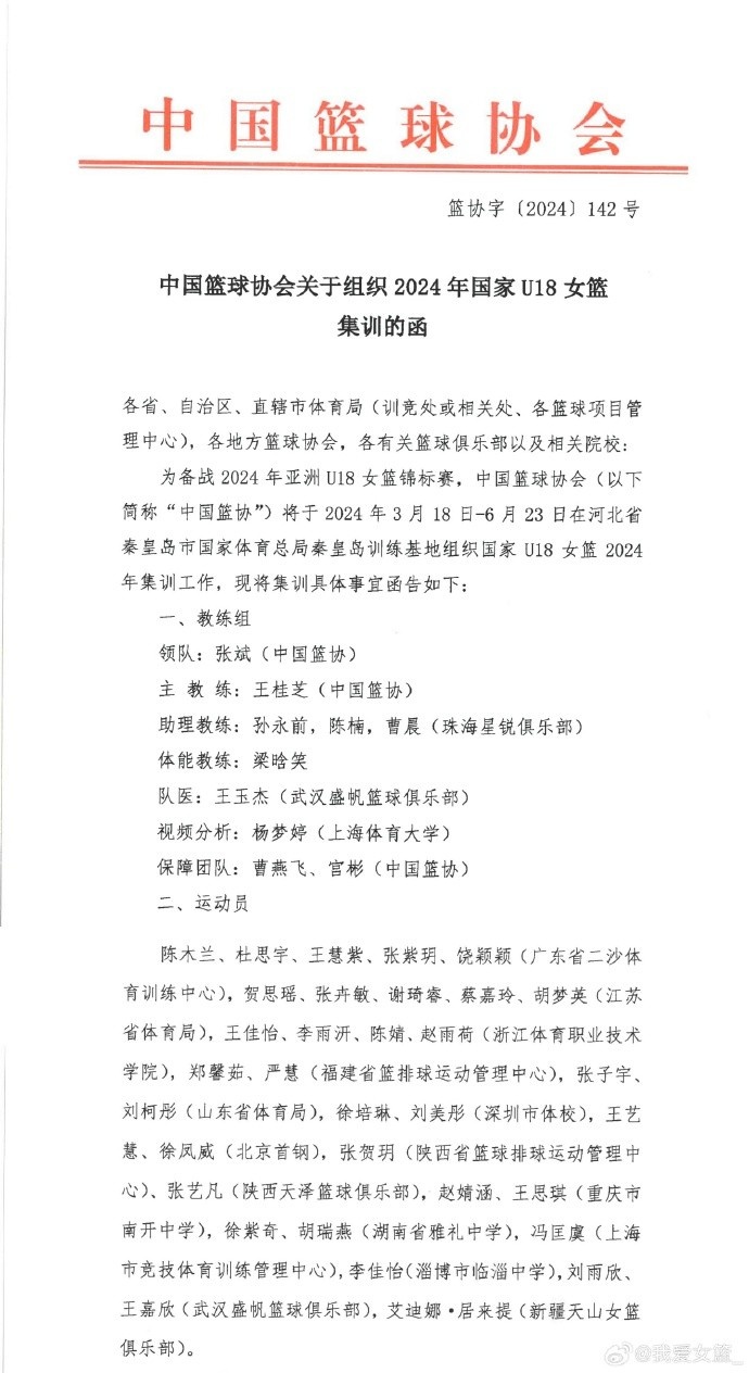 3月19日讯 今日,据博主@我爱女篮报道,张子宇入选最新的U18女篮集训名单。