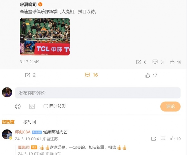 赛后,邱彪凌晨12点多现身山东广播电视台体育频道体育新闻主编夏晓司的微博评论区,鼓励刚刚更换管理层的山东男篮:“越磨砺越光芒。”
