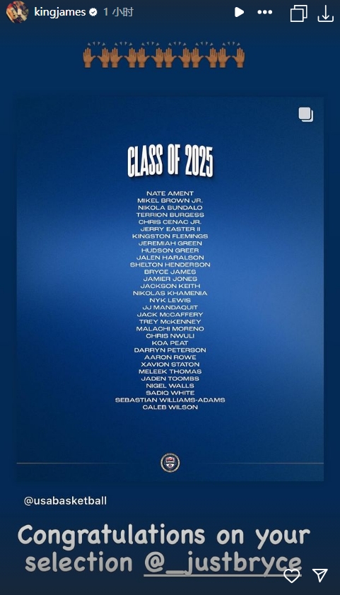 湖人球星詹姆斯的小儿子布莱斯-詹姆斯(16岁),作为2025届的高中毕业生,入选了本次美国篮球国家队青少年迷你训练营的名单。詹姆斯也在个人社媒转发祝贺写道:“恭喜你入选呀!小詹”