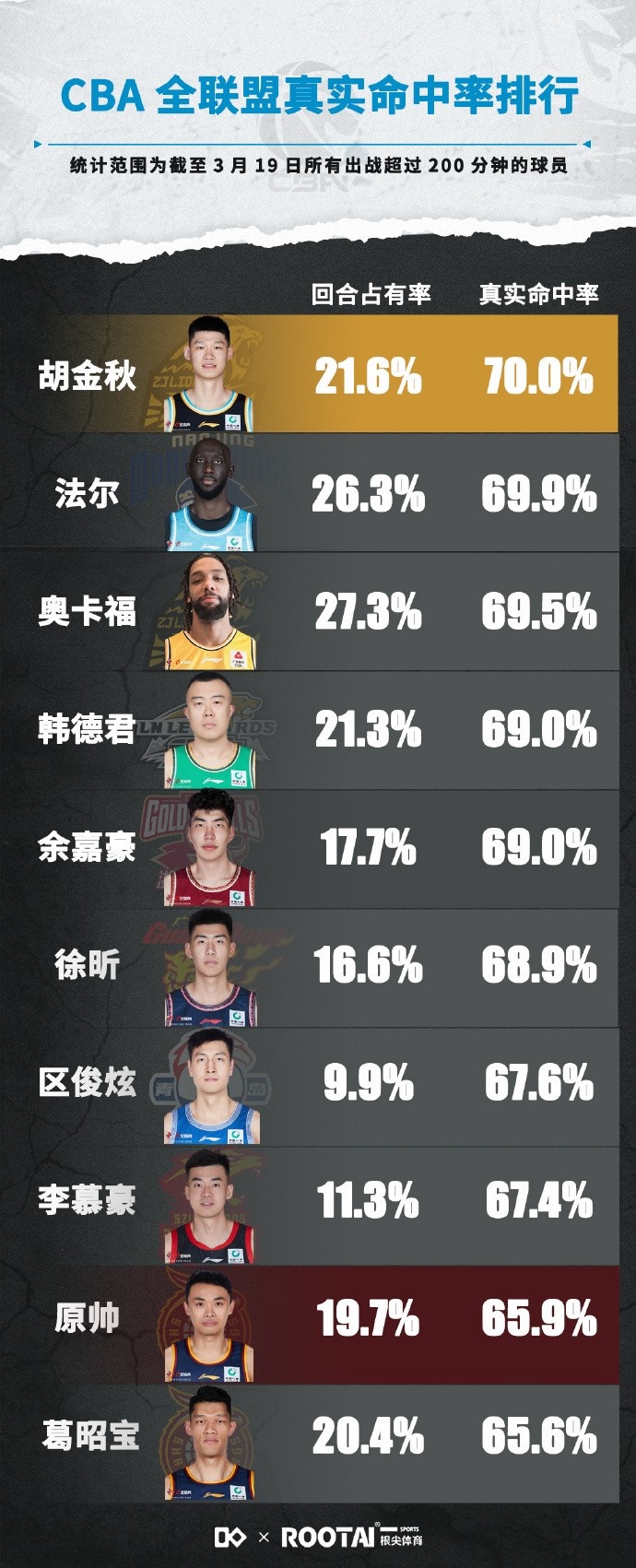 3月20日讯 今天,中国篮协技战术服务平台普罗篮球制图盘点了本赛季CBA所有出战超过200分钟的球员的真实命中率排行的前十榜单,胡金秋居首。
