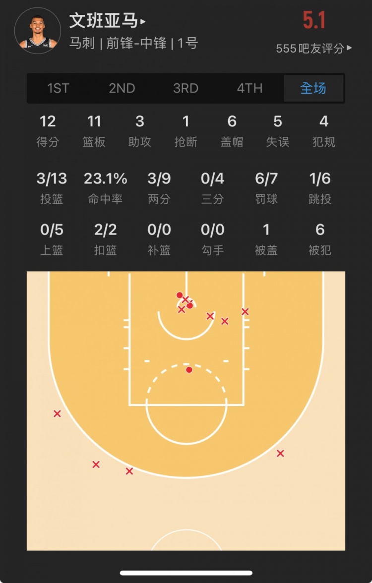 马刺状元秀 维克托-文班亚马 出战32.1分钟