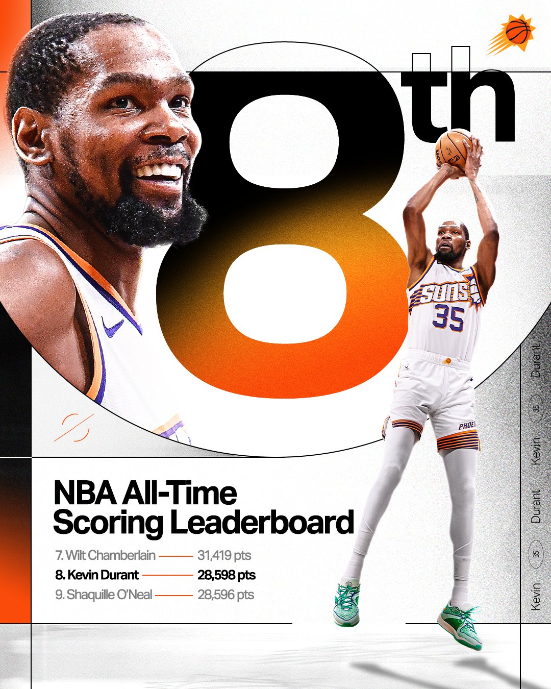 3月21日讯 此前,杜兰特的常规赛生涯总得分超越奥尼尔,上升至NBA历史得分榜第八位。