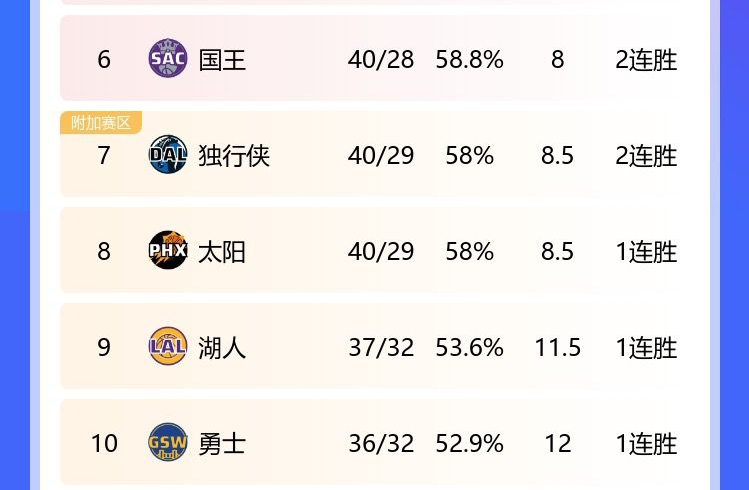 在拿下这场胜利之后,太阳的战绩来到40胜29负,和独行侠持平,因相互交手劣势排在西区第8,领先第9的湖人3个胜场,和第6的国王只差0.5个胜场。