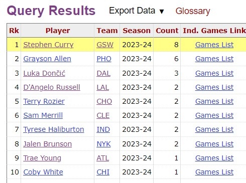 据统计,阿伦本赛季已经有7场比赛至少命中8记三分,仅次于库里(8场)。