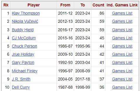 这是克莱生涯第87场比赛在没有获得罚球机会的情况下砍下20+,继续领跑这项统计。