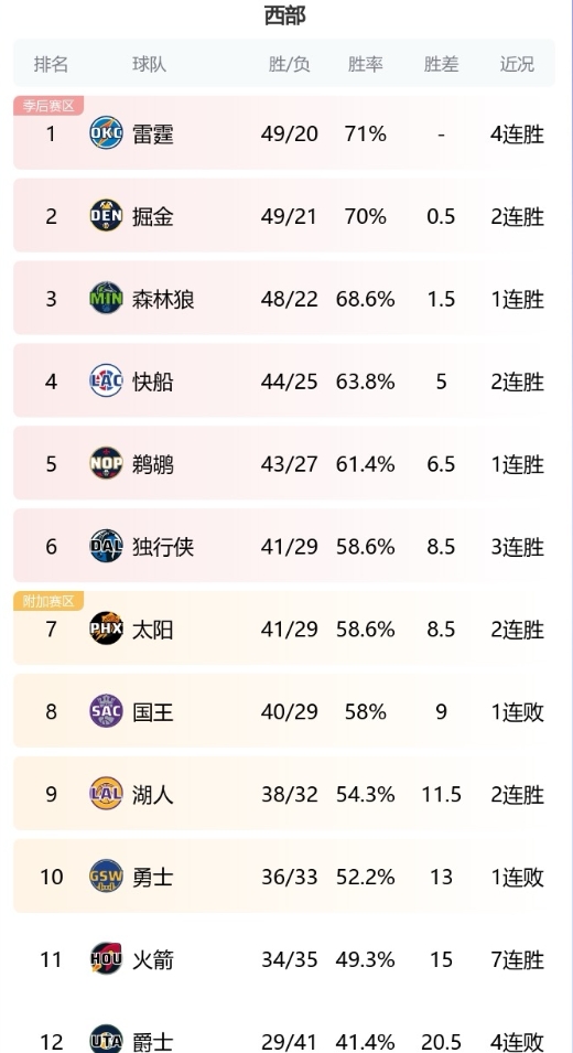 今日过后,第九的湖人已经领先第十的勇士1.5个胜场,仅领先火箭2个胜场。