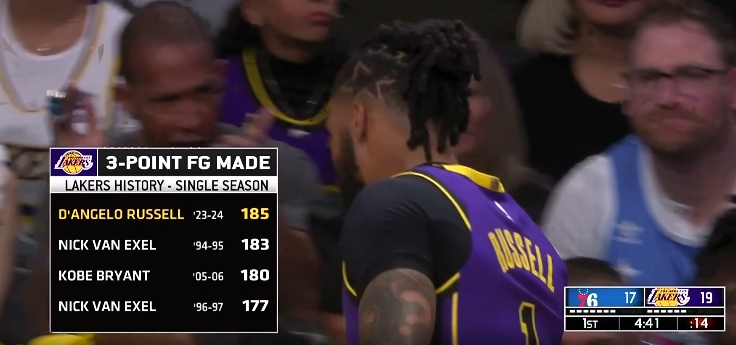 赛后,拉塞尔接受了记者采访。谈到自己成为湖人单赛季三分王,他说道:“能够成为球队的一部分感觉很棒。这支球队(湖人)是最富盛名的,因此能够拥有这样的纪录,我非常感激。现在我会试着继续提升这个纪录。”