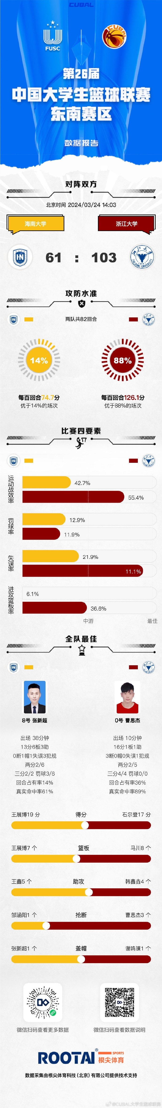 末节开局海南大学依靠林升瑞和王展博的连续拿分抢开局,浙大这边手握大比分领先没有太大压力,随着姚宇航也拿下2分,浙大12人登场全部有得分入账,双方也以练兵形式打完第四节比赛。最终,浙江大学103-61击败海南大学拿下比赛。