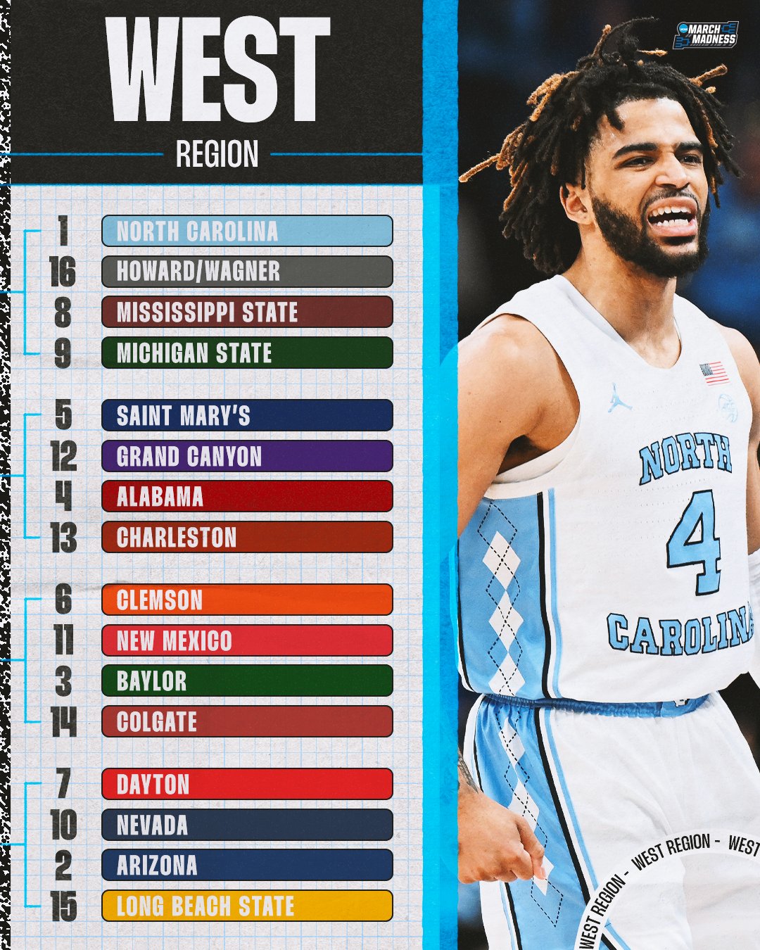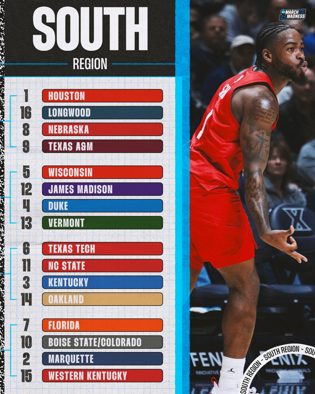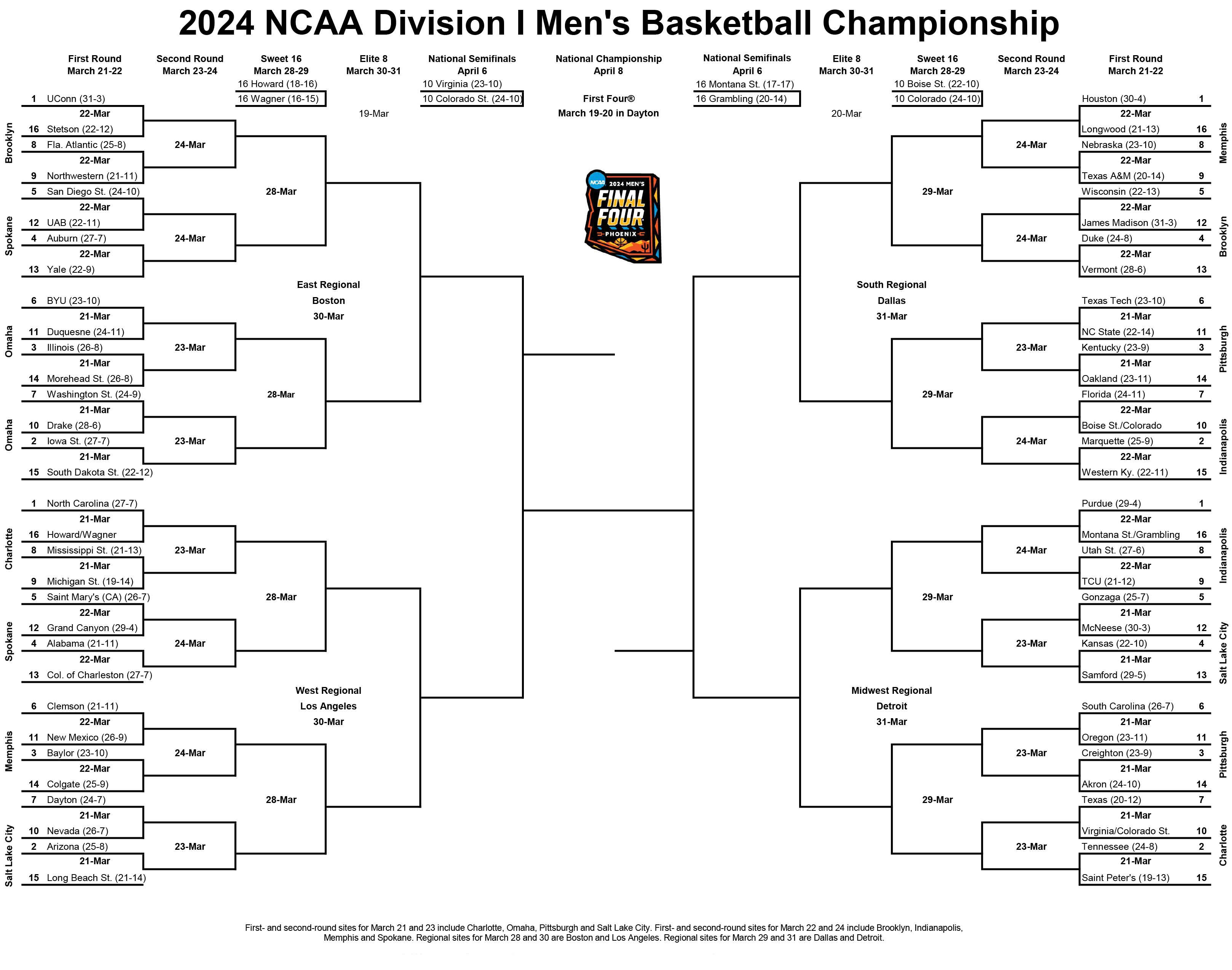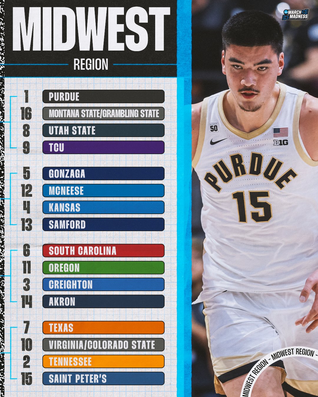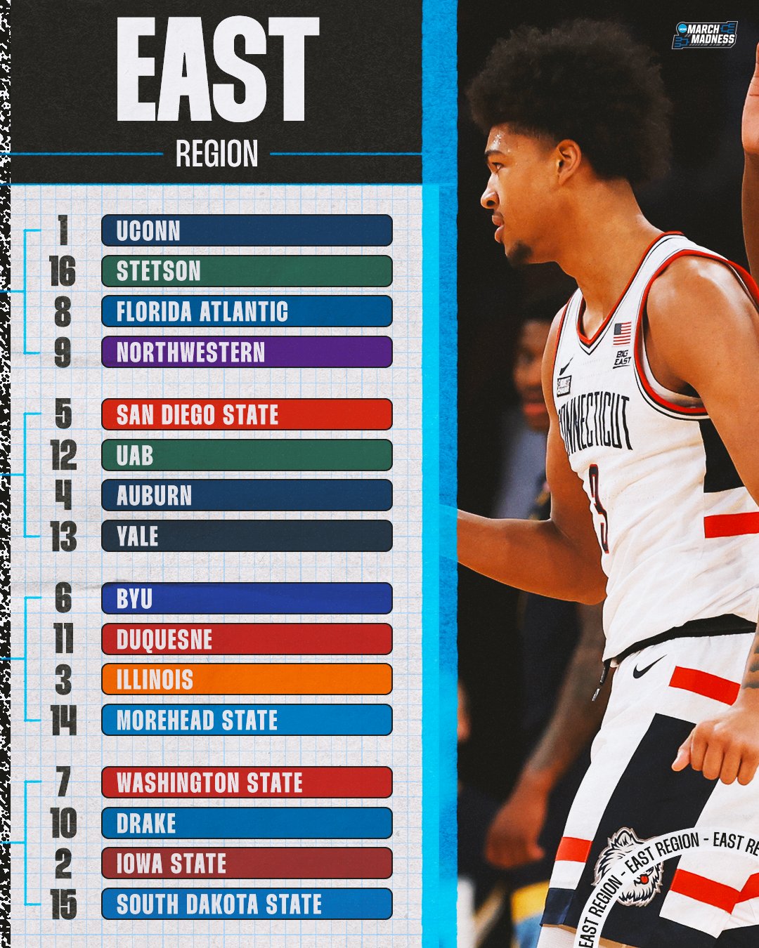 卫冕冠军康涅狄格大学是东区1号种子,这是他们队史首次拿到NCAA锦标赛的头号种子。此外南区1号种子是休斯顿大学,中西区1号种子是普渡大学,西区1号种子是北卡大学。