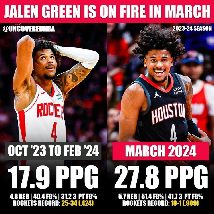 3月份,杰伦-格林场均27.8分5.7板,投篮命中率51.4%,三分命中率41.7%,战绩10胜1负