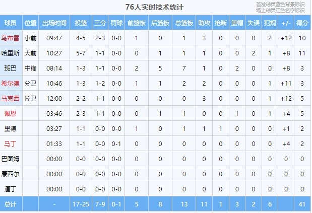 第一节,76人外线开火,全队单节三分9投7中,轰下41分,首节结束以41-29领先快船12分。乌布雷首节命中2记三分。