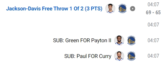 库里下场时,勇士领先4分: