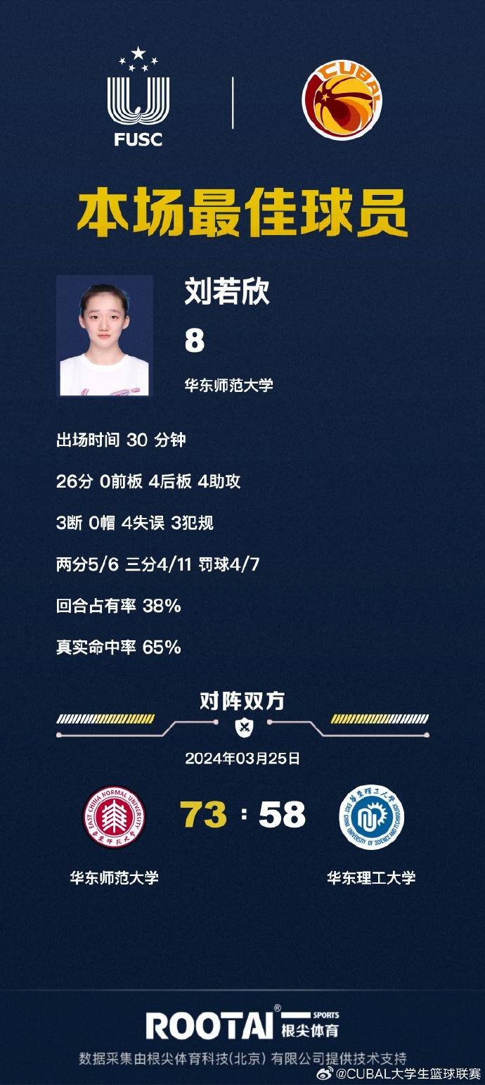 末节决战,刘若欣继续保持进攻端的稳定,双方都很拼但受到体力影响效率并不高,张雨薇接连中投继续追分,金子萱切入上篮后吴睿三分还能回应,华东师大牢牢掌握住双位数领先,华东理工接连二次进攻打成,刘若欣里突外投连砍5分还能强势回应,最终华东师大73-58力克华东理工。