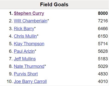 据统计,截至目前,库里生涯投篮命中数已经达到8000,队史第一人!