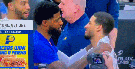 老当家与新当家!乔治赛后与哈利伯顿拥抱畅聊