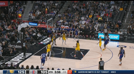 3分55秒乔治进球,步行者的24秒表在3分48开始走