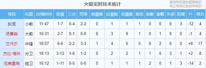 兰代尔半场出战18分钟,投篮6中6,三分2中2,罚球3中3,拿到17分5篮板2盖帽0失误0犯规,正负值+8!