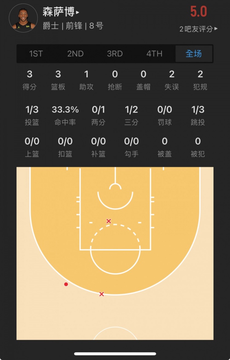 爵士28号秀 布莱斯-森萨博 出战16.4分钟