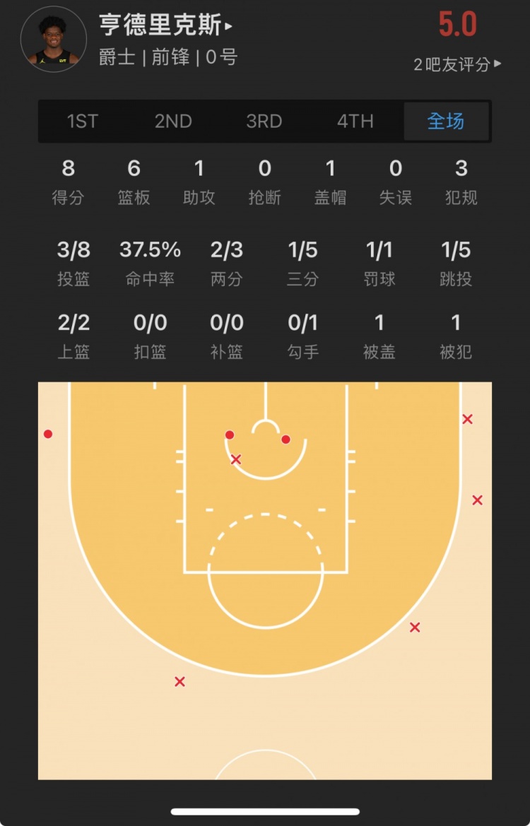 爵士9号秀 泰勒-亨德里克斯 出战28.9分钟