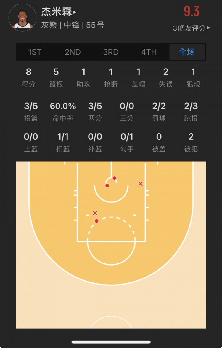 灰熊落选秀 特雷-杰米森 出战21.7分钟