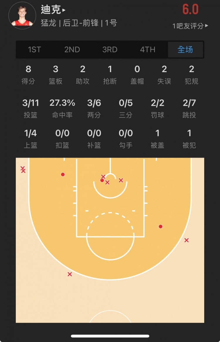 猛龙13号秀 格雷迪-迪克 出战32.6分钟