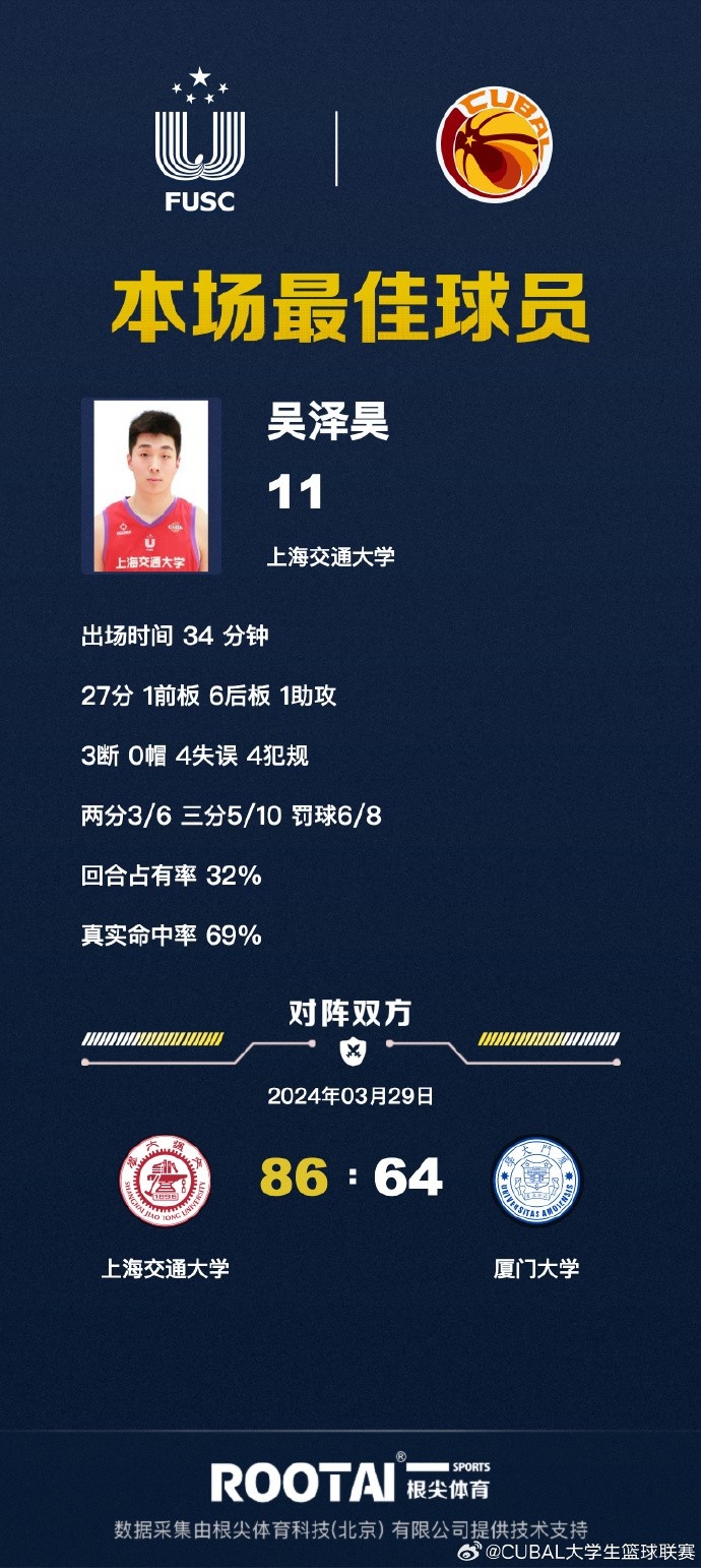 上海交大:吴泽昊27分7篮板3抢断,顿家威21分9篮板3助攻,冯祥硕14分4助攻,胡汇11分7篮板4抢断,刘冠男6分8篮板