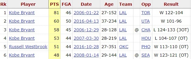 据统计,过去20年,单场出手至少44次球员有三人:科比、威少、和今天的穆雷。