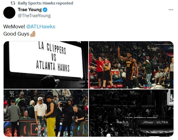 赛后,因伤缺阵的老鹰当家球星特雷-杨发推晒出本场比赛照,并写道:“老鹰我们继续冲!好样的兄弟们。”