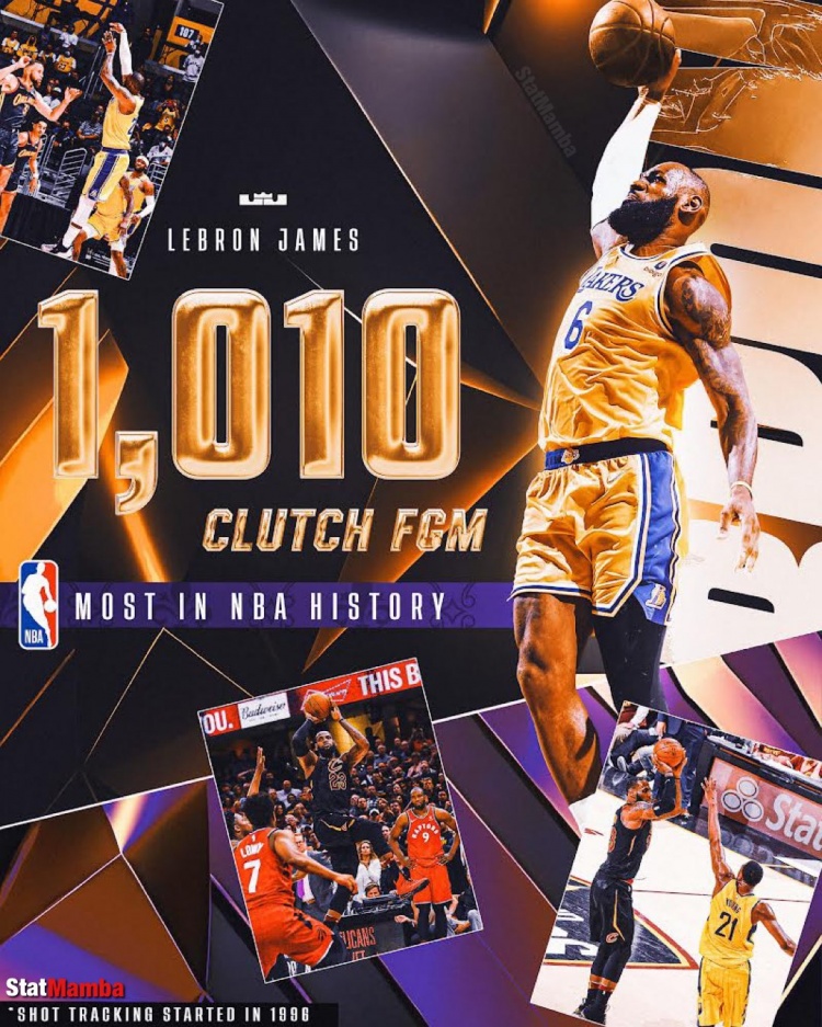 詹姆斯职业生涯已在比赛关键时刻(比赛最后五分钟,分差五分以内)命中1010球(常规赛+季后赛),NBA历史第一
