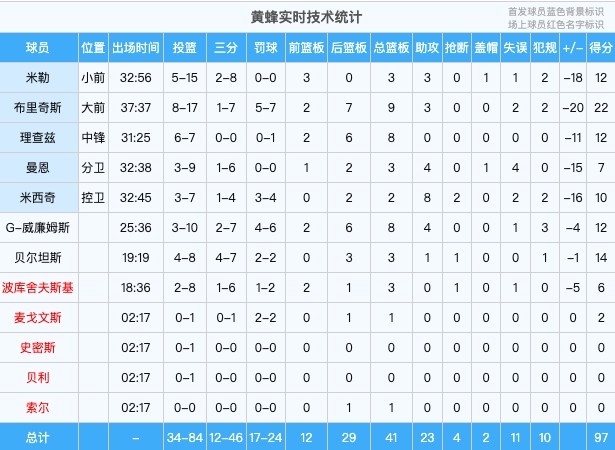本场比赛,黄蜂全队6人得分上双但仍难敌对手。他们是:迈尔斯-布里奇斯22分、贝尔坦斯14分、格威12分、布兰登-米勒12分、理查兹12分、米西奇10分。