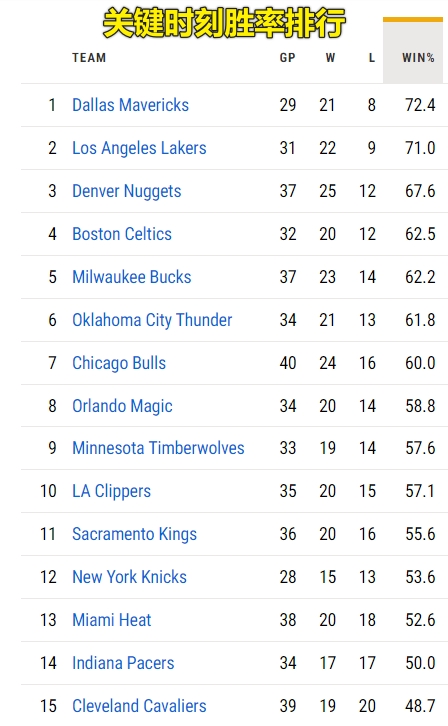 03月31日讯 本赛季关键时刻(第四节最后五分钟和加时赛,分差在5分和以内的时间段)的相关统计: