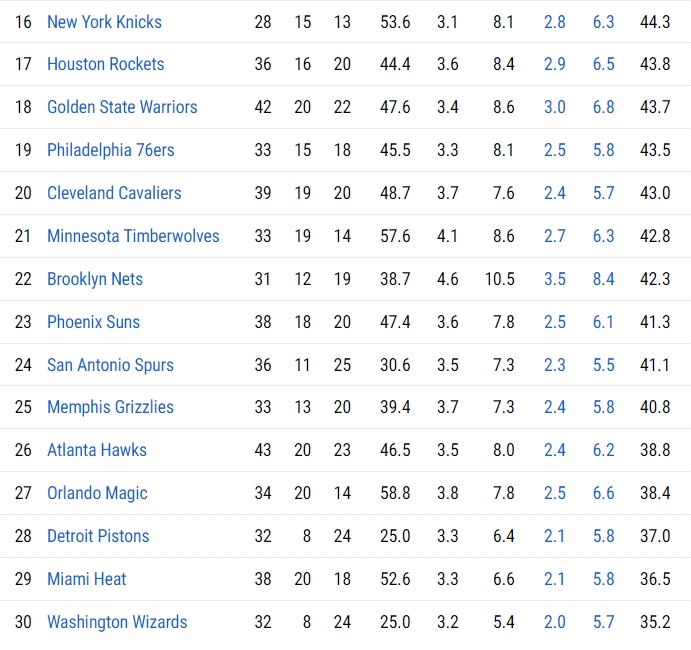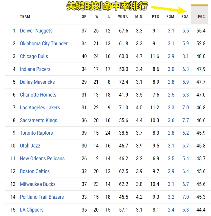命中率方面,掘金55.4%第一,雷霆52.8%第二,公牛48.0%第三。