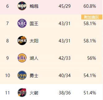 国王战绩来到43胜31负,反超太阳升至西部第7。排在后面的分别是太阳、湖人、勇士。
