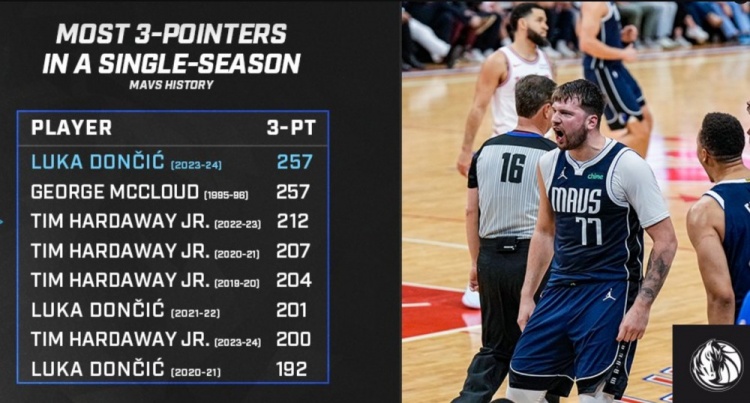 至此,东契奇本赛季已经投进了257个三分,单赛季三分命中数追平乔治-麦克劳德,并列独行侠队史一。