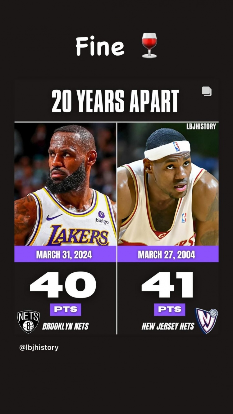 詹姆斯更新IG动态晒出自己本场比赛与2004年3月27日时隔20年对阵篮网数据对比照。