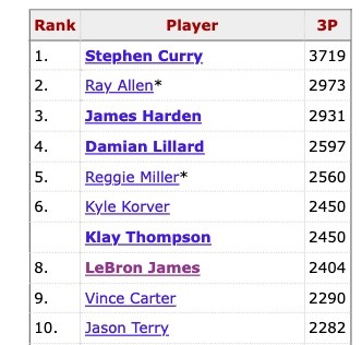首节命中一个三分后,克莱生涯三分命中数来到了2451个,超越科沃尔(2450个),独占NBA历史第六。