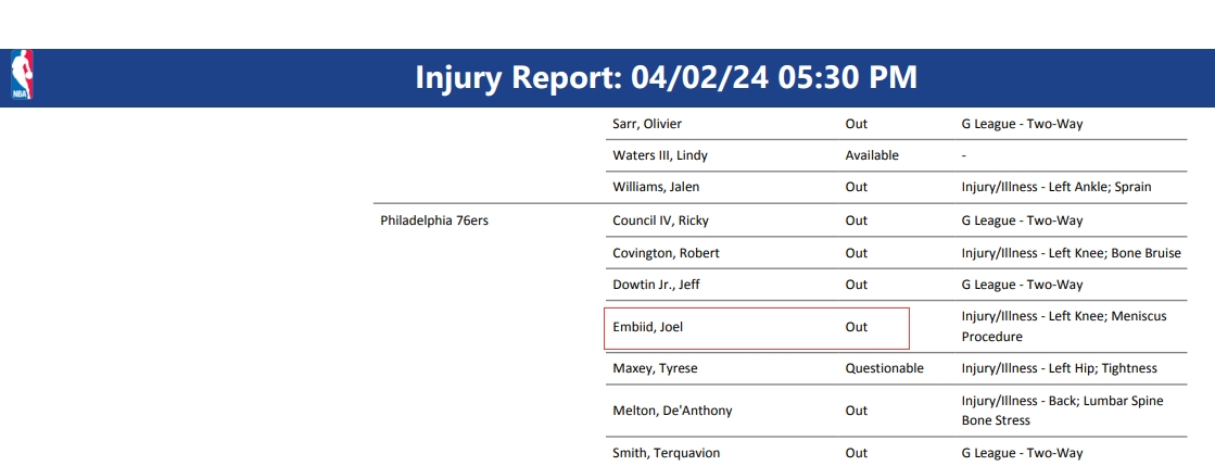 04月03日讯 据TNT现场记者Jared Greenberg报道,NBA预计将调查76人如何处理恩比德在赛前伤病名单一事。