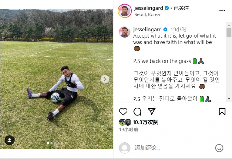 4月5日讯 林加德更新社媒晒出自己的训练近照,并配文自勉:拥抱现在,释怀过去,相信未来