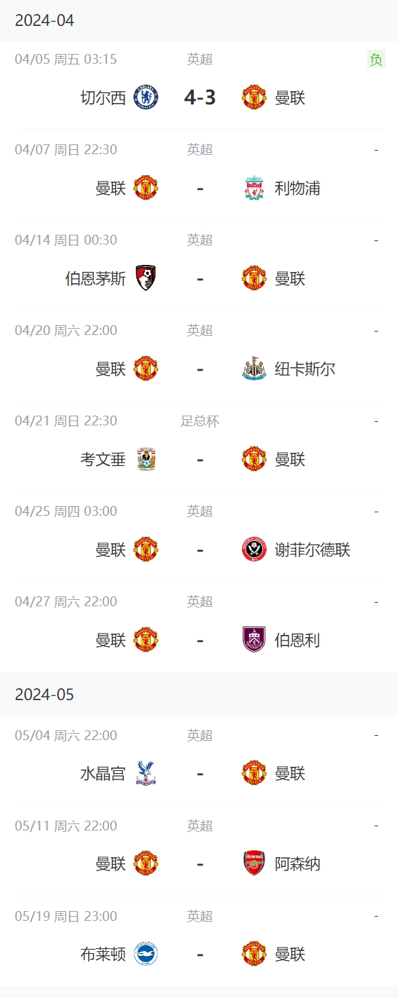 曼联本赛季目前还有8轮比赛,对手包含利物浦、纽卡、阿森纳、布莱顿等队。
