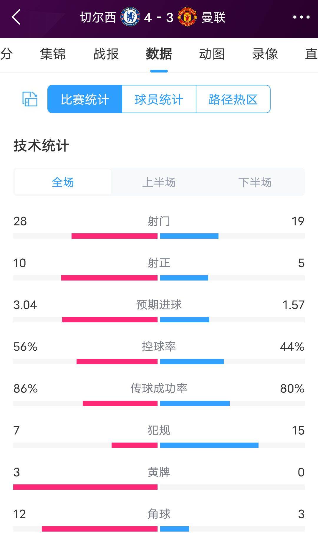 全场数据方面,曼联遭对手狂轰28脚,控球率、预期进球等数据也不如对面。