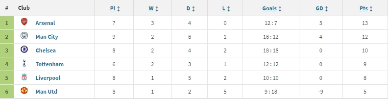 在本赛季传统big6的相互交锋榜中,切尔西跃居第3,曼联依旧垫底。