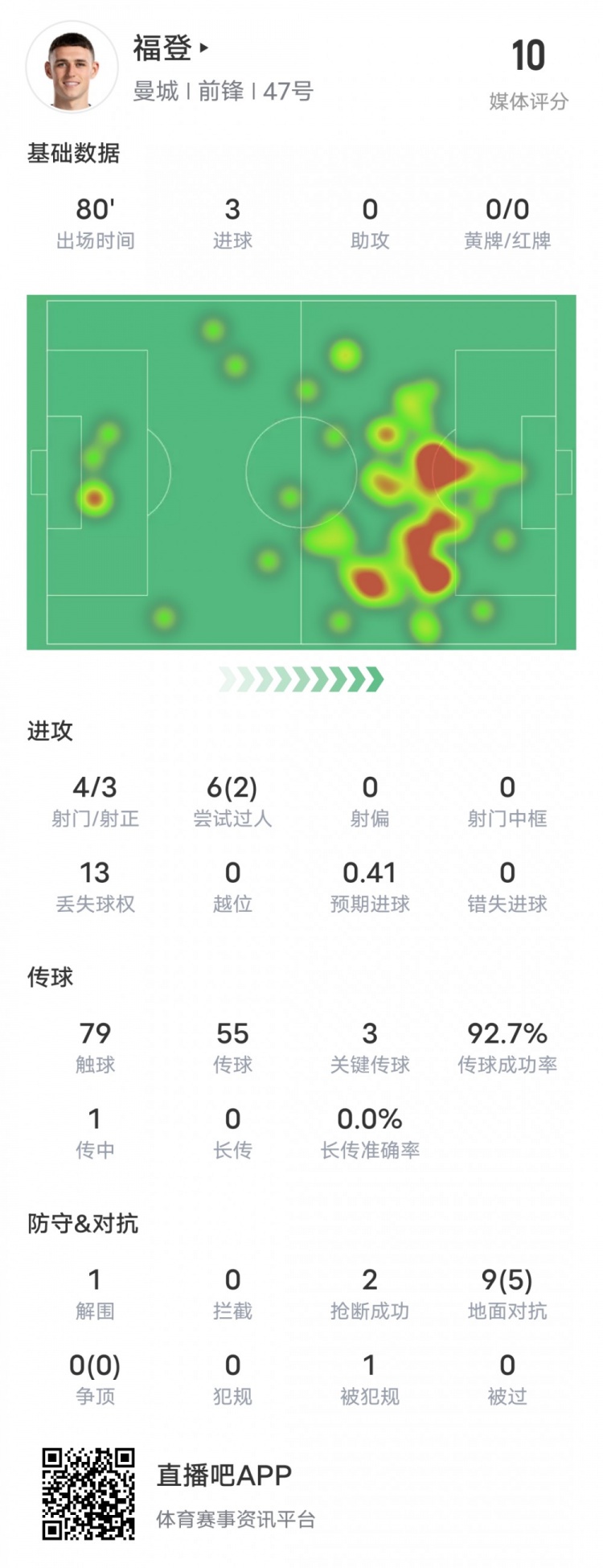 关键时刻的关键进球,这就是福登的大心脏属性。本赛季福登在上半场结束前、和60-80分钟关键节点破门数达到了10次,占据了他总共进球数的近半数(22球12助攻)。由此可见其个人的价值。