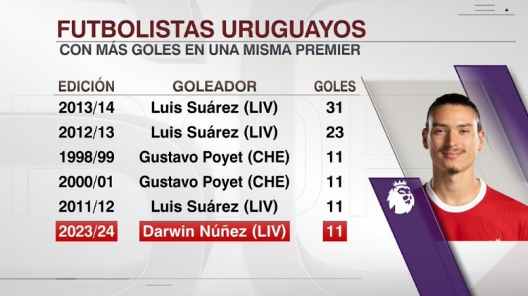 4月5日讯 在英超第31轮比赛中,努涅斯破门,帮助利物浦主场3-1击败谢菲联,据ESPN统计,努涅斯本赛季英超打进11球,并列排名乌拉圭球员英超单赛季进球榜第三位。