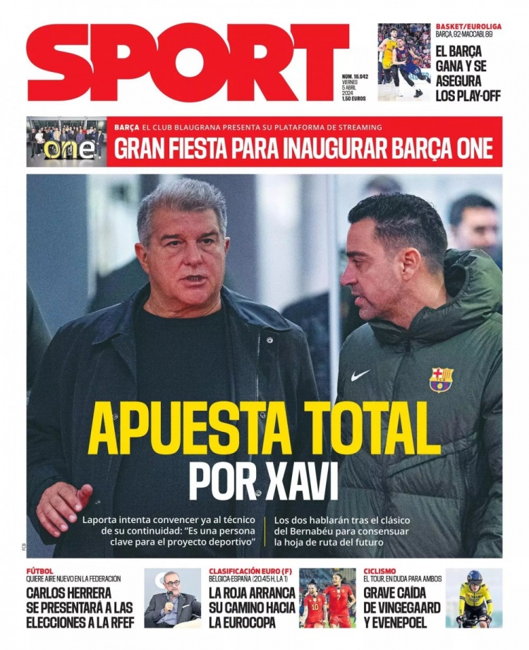 4月5日讯 《每日体育报》今日头版,拉波尔塔劝说哈维留队,两人将在国家德比后会谈。