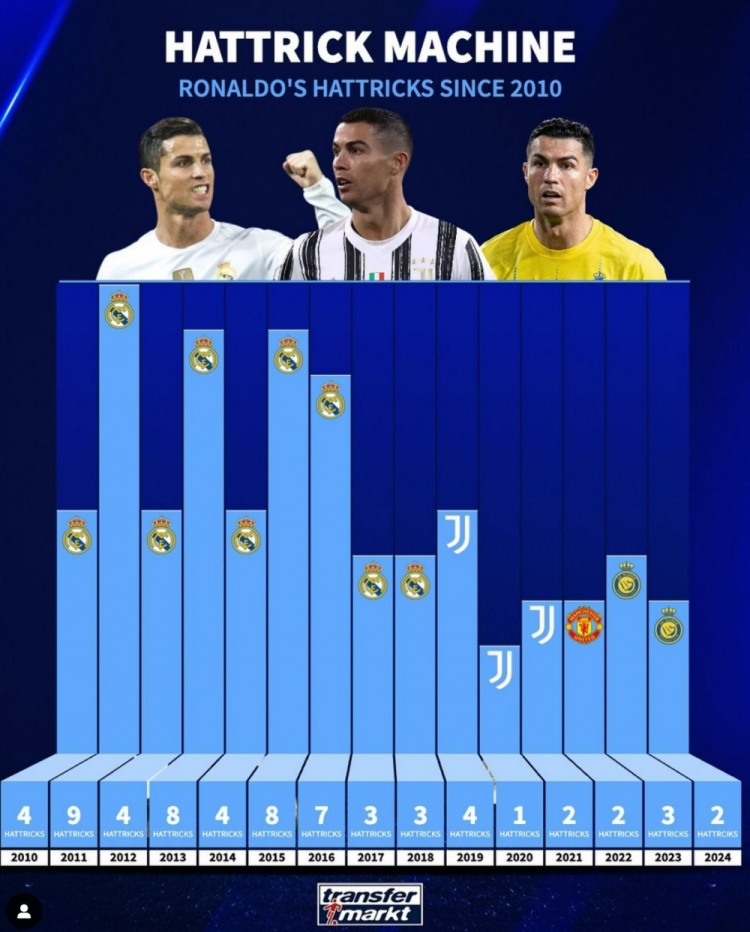 4月5日讯 39岁C罗已经连续两场在沙特联上演帽子戏法,德转也盘点了C罗自2010年来历年完成帽子戏法次数,具体如下: